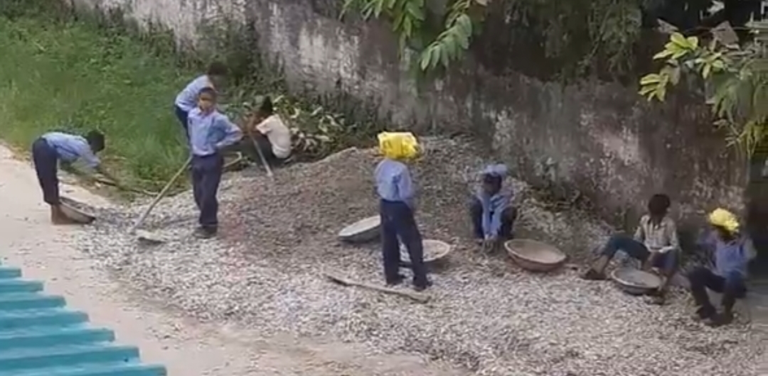 06.10.2025 को विद्यालय में अध्ययनरत छात्रों से रेत बजरी उठावाकर मजदूरी करवाया जाना ।