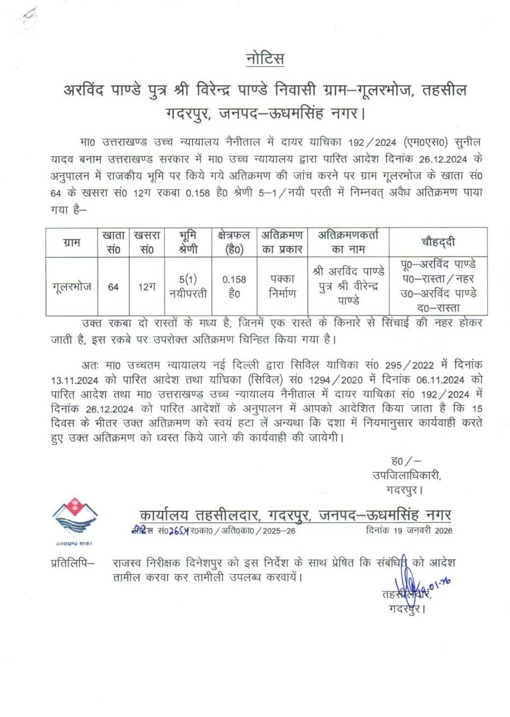 देहरादून– तहसील प्रशासन ने हाल ही में पूर्व कैबिनेट मंत्री और गदरपुर से पांच बार के भाजपा विधायक अरविंद पांडे के गूलरभोज स्थित आवास पर अवैध अतिक्रमण को लेकर नोटिस चस्पा किया है। नोटिस में स्पष्ट निर्देश दिए गए हैं कि 15 दिनों के भीतर सरकारी/राजकीय भूमि से अतिक्रमण हटाया जाए, अन्यथा प्रशासन स्वयं बुलडोज़र चलाकर निर्माण ध्वस्त करने की कार्रवाई करेगा।