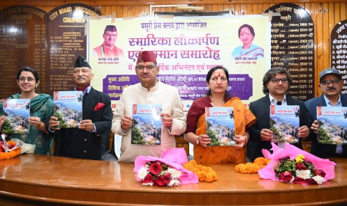 देहरादून/मसूरी– कैबिनेट मंत्री गणेश जोशी ने आज मसूरी नगर पालिका सभागार में मसूरी प्रेस क्लब द्वारा आयोजित स्मारिका लोकार्पण एवं सम्मान समारोह में प्रतिभाग किया। इस अवसर पर उन्होंने प्रेस क्लब द्वारा प्रकाशित स्मारिका 2025-26 का विधिवत विमोचन किया। कार्यक्रम के दौरान समाज के विभिन्न क्षेत्रों में उत्कृष्ट कार्य करने वाले व्यक्तित्वों को भी सम्मानित किया गया।